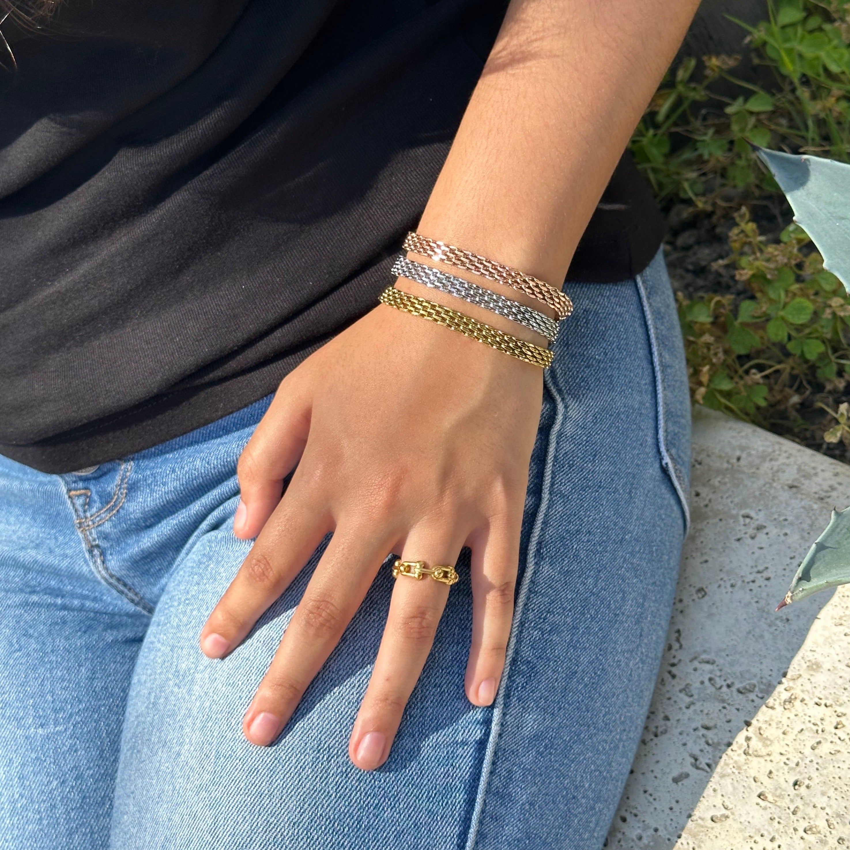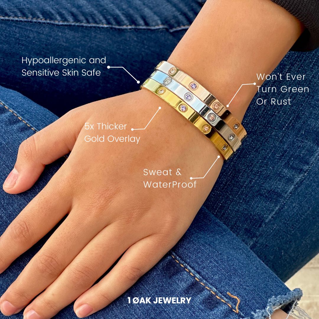 Bought this bracelet to match a few other gold style bracelets and OMG! This is honestly the cutest bracelet ever, not only does it fit my wrist (I asked for it to be a little smaller than 5.5) I don't have to worry ab taking it off and putting it back on because it doesn't rust. I recommend this bracelet 100%!!